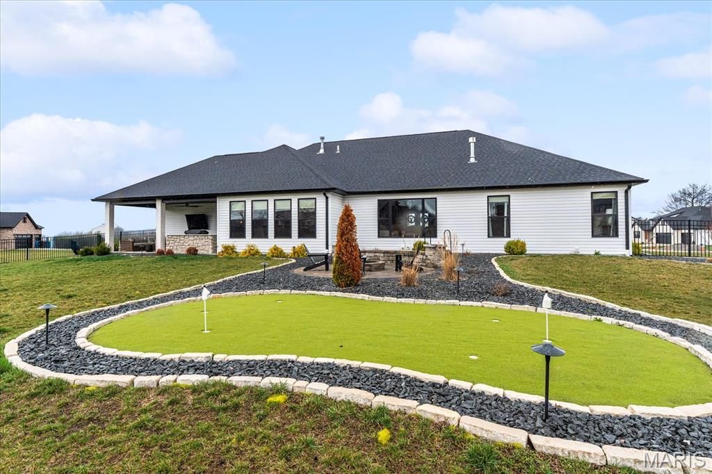 Nearly new and absolutely stunning ranch in the highly desirable Summit of Shiloh! Built in 2023 and situated on a spacious .87-acre corner lot, this beautifully designed home offers the perfect blend of luxury, space, and modern convenience. The open-concept main level features vaulted ceilings, luxury vinyl plank flooring, and an expansive living room with fireplace that flows seamlessly into the kitchen and dining area. An open and well appointed kitchen with breakfast bar, built-in features, and generous workspace is designed for both everyday living and entertaining. A flowing main level includes 3 bedrooms, including a spacious primary suite with private bath, plus convenient main floor laundry. The finished lower level adds incredible living space with a large recreation room, 2 additional bedrooms, full bath, and ample storage-perfect for guests, entertaining. Step outside to enjoy the thoughtfully designed back yard featuring a putting green, playground area, huge covered patio with blackstone built-in with stone counter and countertop, fire pit with stone bench wall seating. An ideal space for relaxing or entertaining. This exceptional home offers space, comfort, and style in a fantastic location near shopping, dining, and top-rated schools. Don't miss your opportunity to make this incredible home yours!